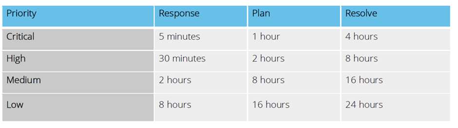 A final point on this is that these times should be measured as part of your Service Level Agreement (SLA) with your Managed Service Provider. Your MSP should be able to tell you how many tickets have been logged, and how many have not met the agreed times (I will cover this in more detail in my blog post on ‘Reporting’).